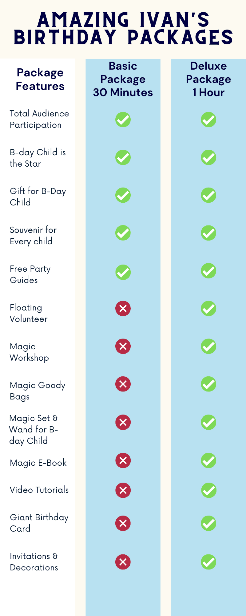 Well, to begin with, Ivan offers 2 different packages to suit everyone’s budget and party. Both of our party package solutions provide a guaranteed, laughter-packed, jaw-dropping blend of magic, comedy, audience participation, and 100% squeaky clean family fun. There is no off-color humor or experimental material in our shows. It’s all tested, tried, and true A+ material.